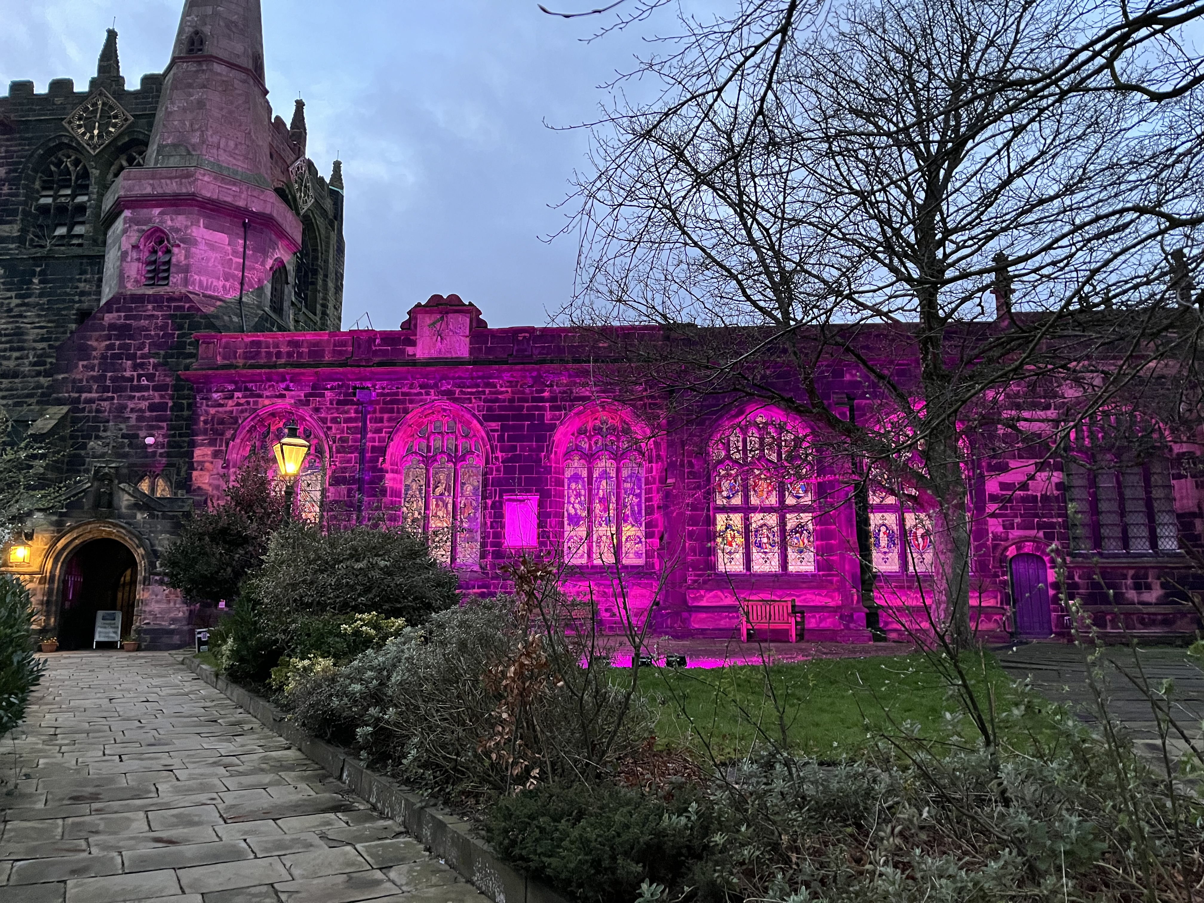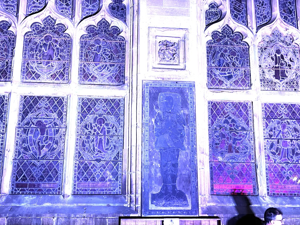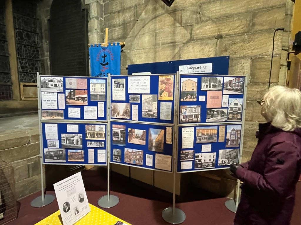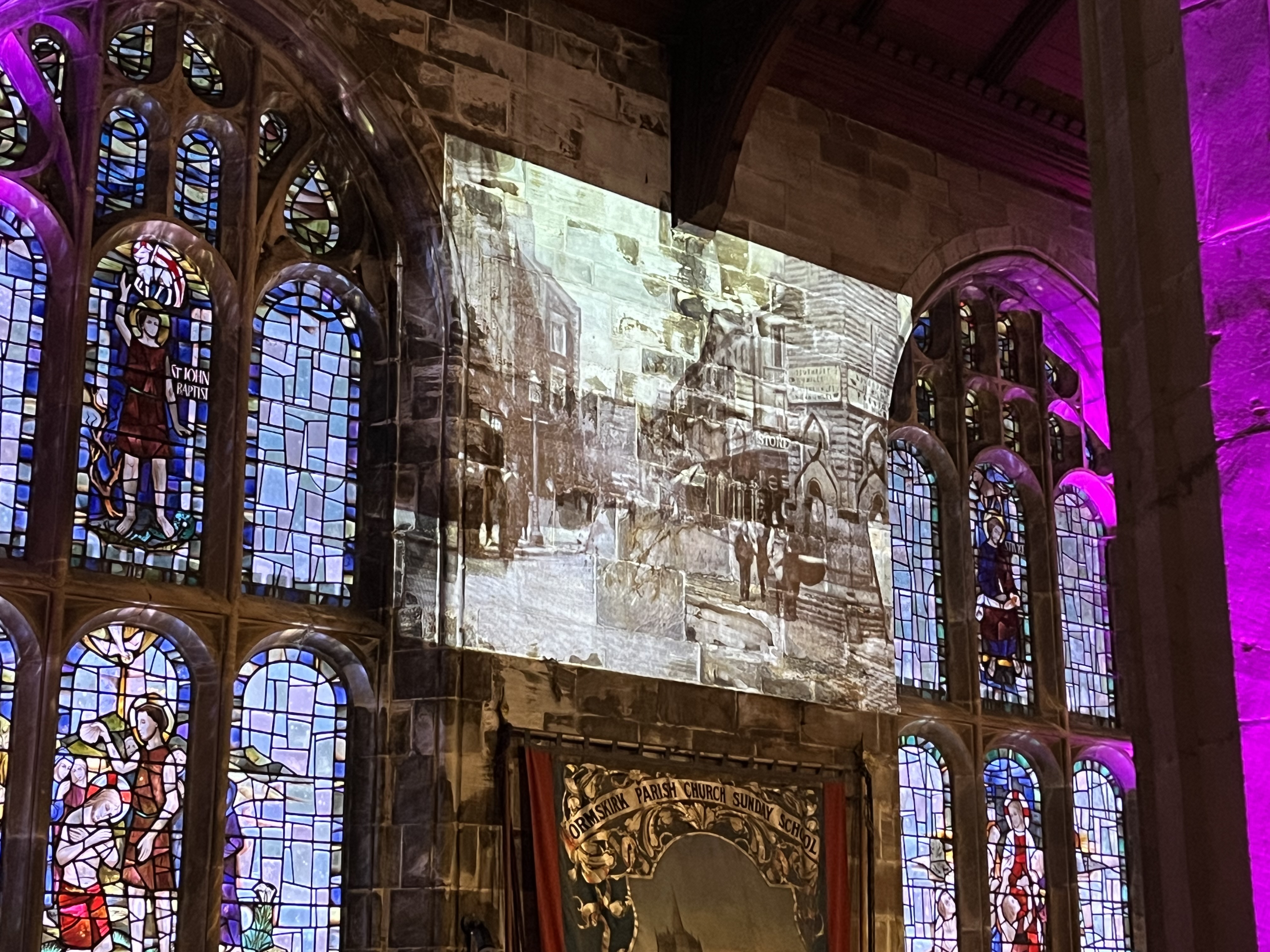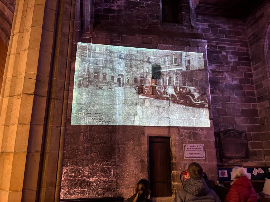 A drop-in session facilitated by local historians and through Edge Hill University offered a spectacular display of local history documents and photographs in the Tower Room, with an opportunity for local families to recount their own history. This was accompanied by external and internal flood lighting of the building, with additional images of the town in years gone by, projected as a rolling display onto the walls of the building, as seen in the photographs following: