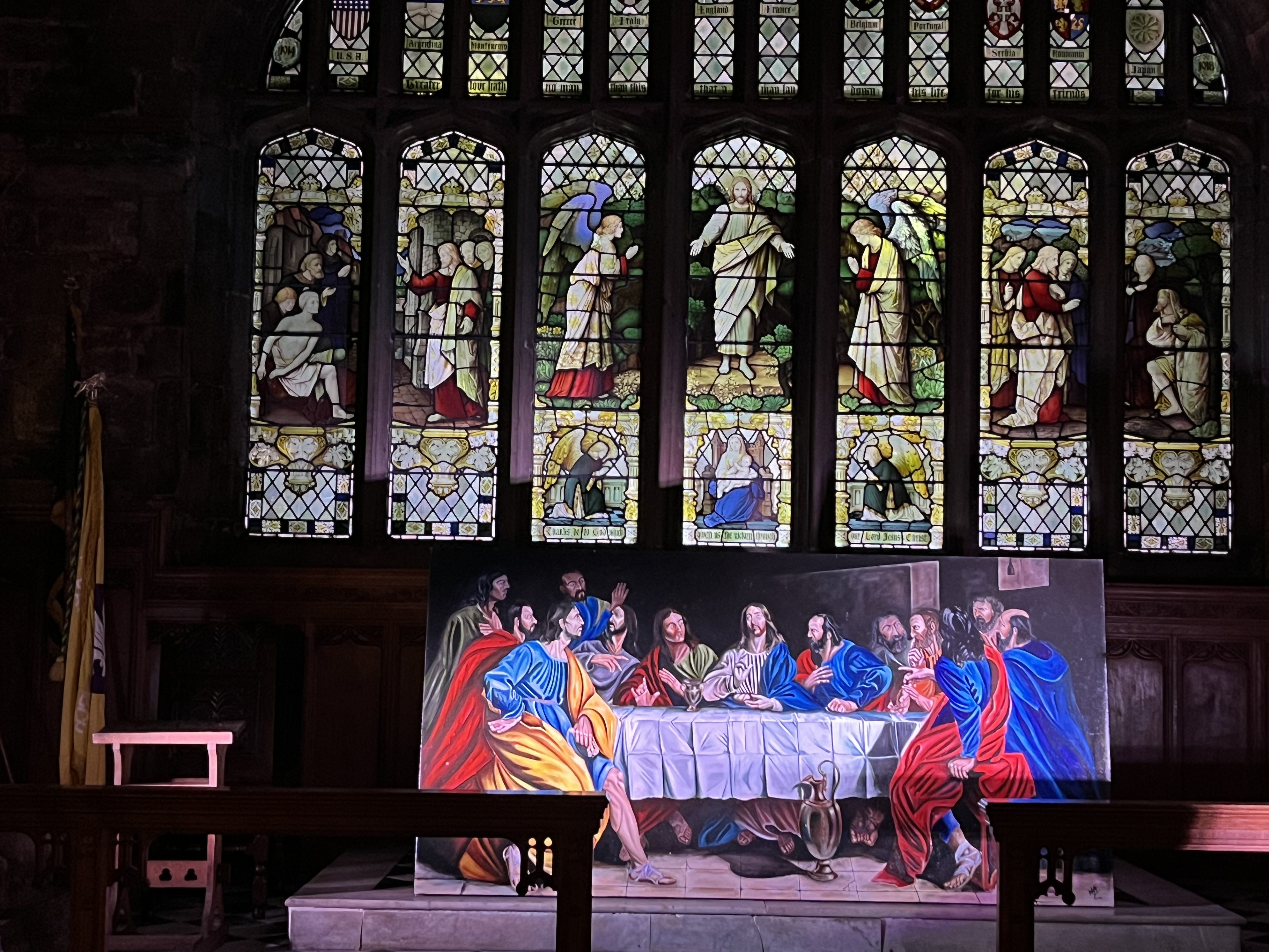 The artist is Wayne Catterall, who recently wrote, “I am so pleased and grateful that my painting has found its way to this beautiful church in Ormskirk for people to see, and to hear that so many have enjoyed looking at it for a year now.” Wayne completed the painting whilst having attended an art class at Thorn Cross Prison in 2014, discovering ‘a version of myself I never knew existed’, through painting. Having served time for serious offences, he had promised to his 5 year-old son that he would put his criminal life behind him, was released in 2016, and has not been back to prison. He concludes, “We have to do what we can to make interventions, break the cycles that are leading far too may of our children and young people into crime and imprisonment. Prison is not somewhere anyone wants to be, I can assure you.”