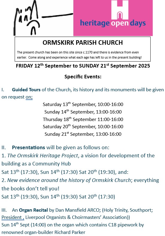 As part of the national Heritage Open Days initiative, Ormskirk Parish Church opened its doors and provided guided tours (usually available on Saturdays and Thursdays during the summer season, or otherwise by appointment, in any case) as well as presentations on plans for celebrating the heritage of this iconic building – the only church in the country to have a tower and spire side-by-side and the symbol of West Lancashire and on recent discoveries which question the accepted and widely-published history of the building, as well as a short recital on the organ which also has its own claim to be of heritage significance, containing some pipework originating from the C18